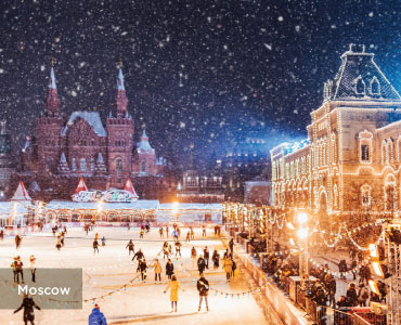 Discover the captivating charm of Moscow in winter, where snow-dusted architecture, festive lights, and lively holiday markets create a fairy-tale atmosphere—and for those seeking even more adventure, add on an unforgettable trip to Murmansk, where the Arctic Circle, polar nights, and the magical Northern Lights